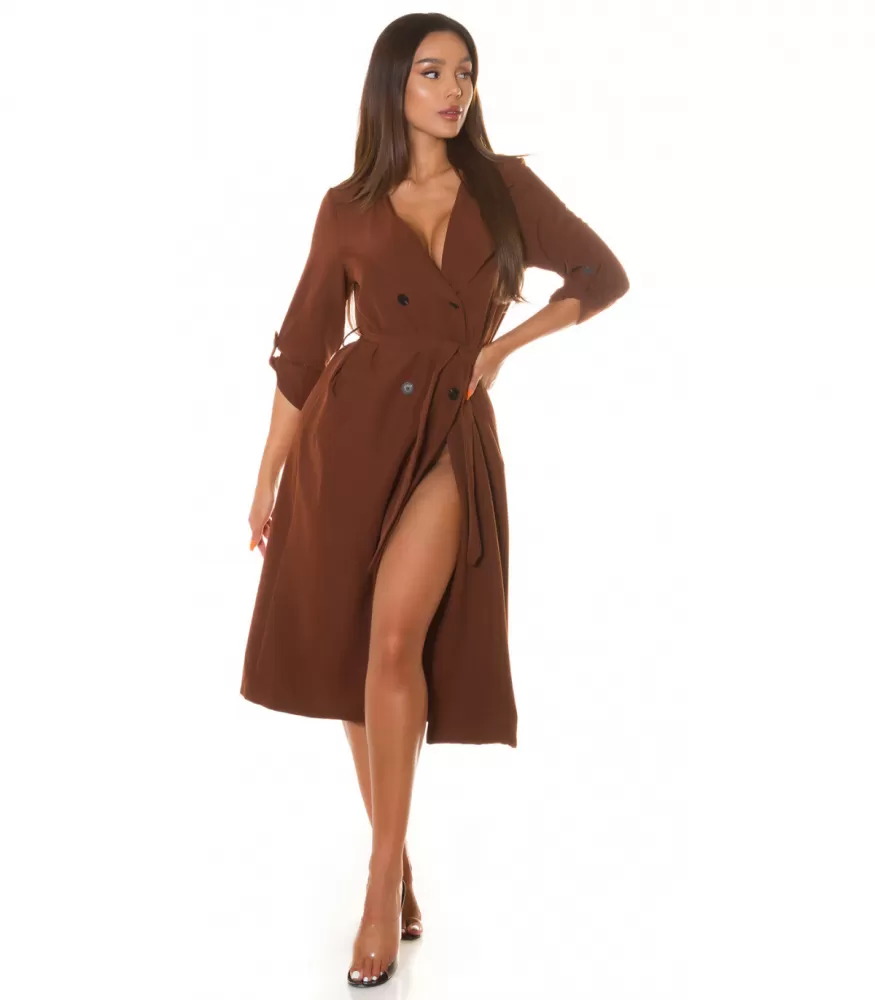 Brun trenchcoat med knappar och skärp. En lång trenchcoat för kvinnor med knappar på ärmarna är lämplig för att bära både en långärmad och, som visas i figurerna, en 3/4-ärm. Den lätta trenchcoaten är en snygg vårkappa, sommarkappa och höstkappa - lämplig för temperaturer på ca 10C+. Vid kallare väder kan du lägga en tröja under trenchcoaten, vid varmare väder räcker det till exempel med bara en miniklänning. En trenchcoat med knappar i bältet ser snygg ut både till byxor och till klänningar eller kjolar. Om så önskas kan jackan även bäras som en klänning som visas på bilderna. Trenchcoat för kvinnor är en moderiktig jacka från år till år.