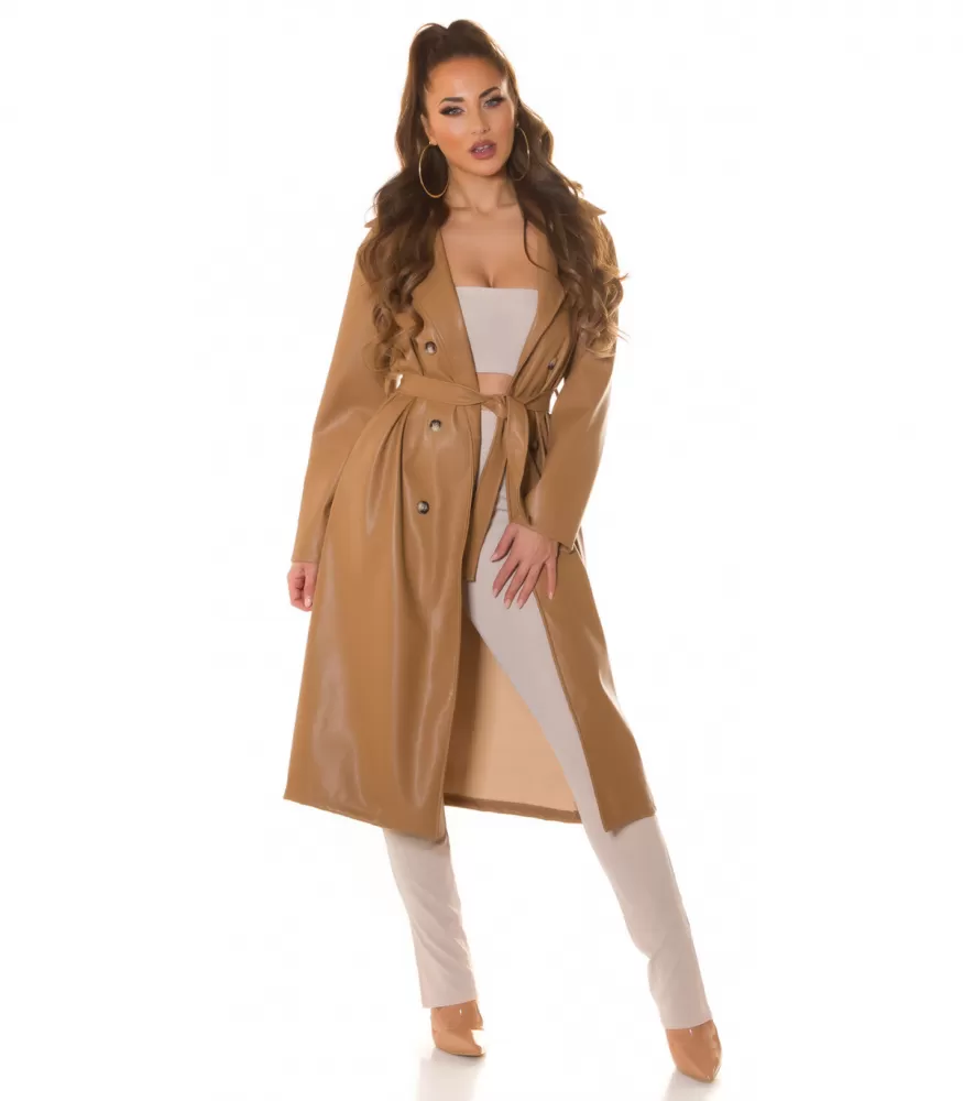 Cappuccino trenchcoat i konstläder med knappar och skärp. Den långa trenchcoaten för kvinnor är en imponerande vårkappa, sommarkappa och höstkappa - lämplig för temperaturer runt 10C+. Vid kallare väder kan du lägga en tröja under trenchcoaten, vid varmare väder räcker det till exempel med bara en miniklänning. En trenchcoat i konstläder med skärp ser snygg ut både med byxor och med klänningar eller kjolar. En trenchcoat för kvinnor är en moderiktig jacka från år till år, och konstlädermaterialet gör att jackan ser spektakulär ut. En lång jacka i konstläder med fantastiska detaljer kommer att glädja dig.