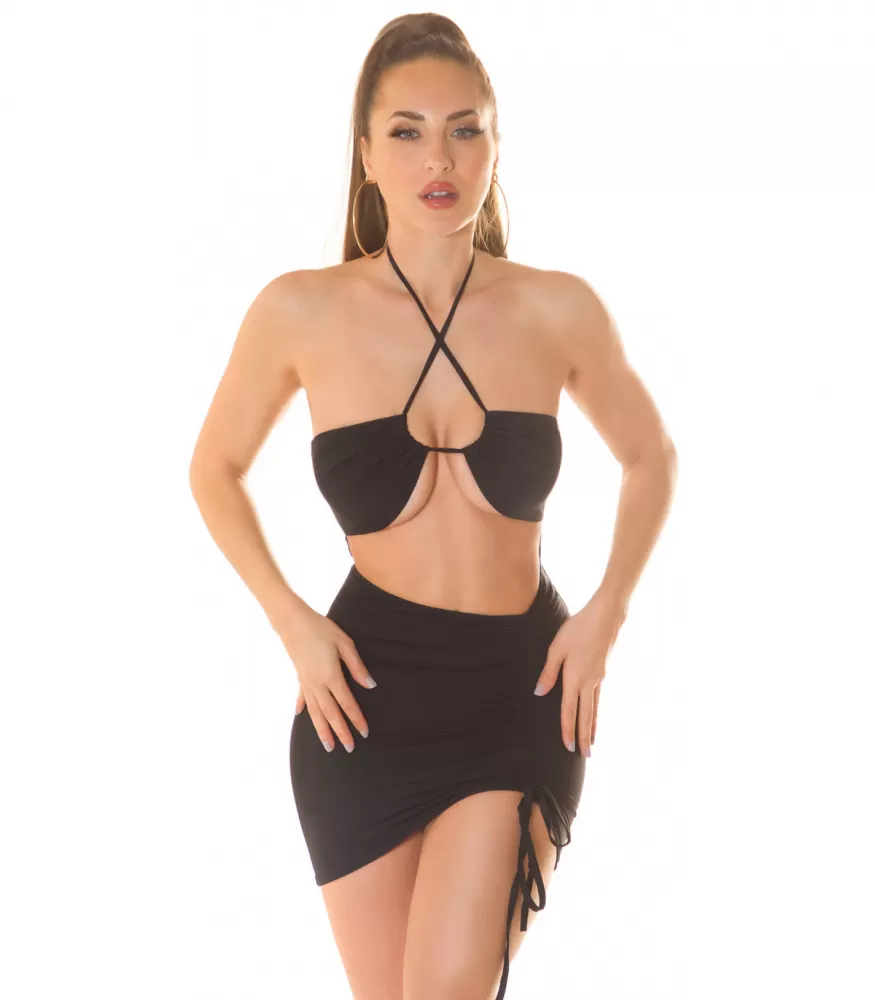 Djärv svart miniklänning med pressveck och snören som knyts bakom nacken. Du kan knyta skosnörena i halterneck-form rakt eller på tvären framifrån - prova vilken stil som passar din kropp och stil bäst! En svart bodycon miniklänning med ett djärvt snitt är endast lämplig för självsäkra kvinnor, för i den här klänningen kommer du definitivt att märkas. En sexig öppen festklänning med en ländryggsbula framtill kommer att fånga ögat. Den här djärva klänningen ser bäst ut utan bh. En tajt klänning ger stöd åt brösten och en modell som knyts bakom nacken ger stöd åt brösten på samma sätt som en stringbikini. Genom att knyta snörena hårdare får du mer stöd för dina bröst. Komplettera den spektakulära festlooken med höga klackar, en liten handväska och vackra smycken. Till exempel kommer en jacka i konstläder att se spektakulär ut med den här klänningen.