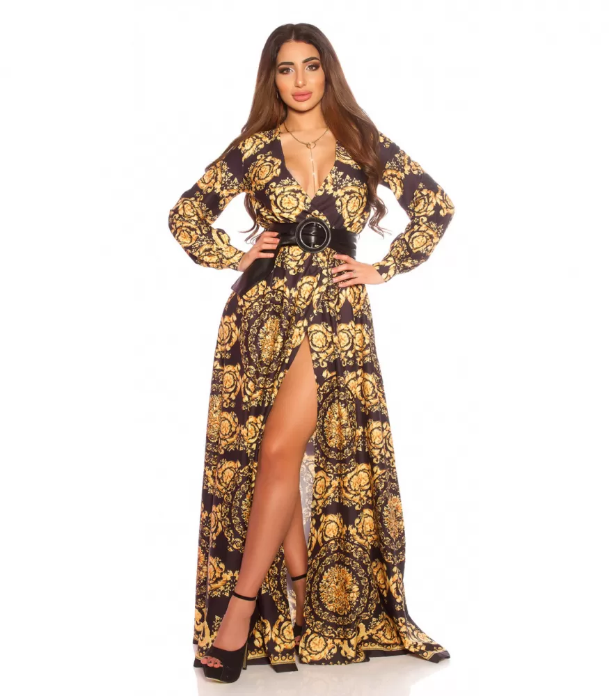 Koucla pitkähihainen printtikuvioinen v-maksimekko halkiolla