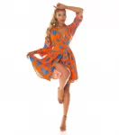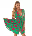 Grön-och-röd långärmad rosmönstrad omlott-look v-klänning med bälte.