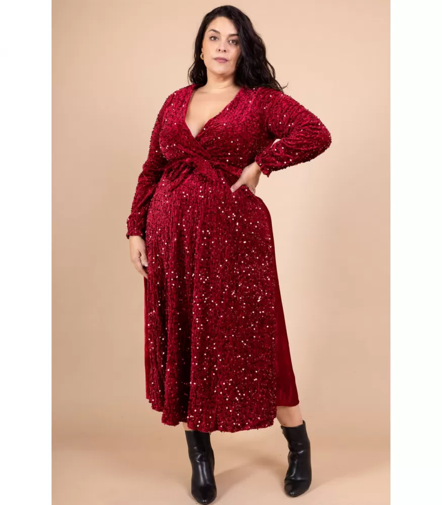 Lilie viininpunainen pitkä v-mekko paljeteilla ja vyöllä (plus size)