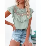 Mintgrön kortärmad broderad löst sittande skjorta med volang. Denna kortärmade vackra mintgröna skjorta sticker ut från mängden. En snygg volangskjorta med vacker dekorativ broderad spets på bröstet är en vacker skjorta, till exempel för en dejt eller för att träffa vänner och släktingar. En volangskjorta är lätt att kombinera med både byxor och kjol.
