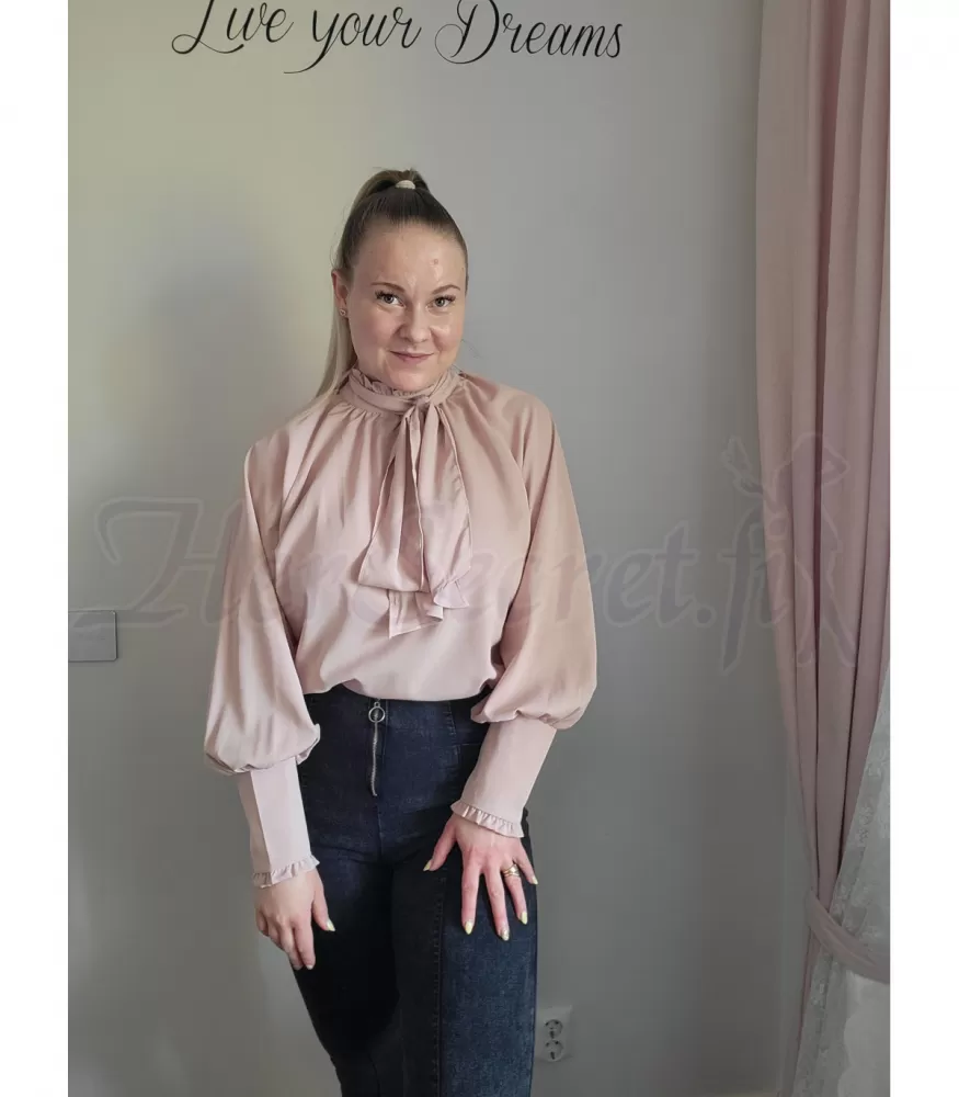 Khaki långärmad löst sittande blus med baggy ärmar och knuten fluga. En fluga knuten till kragen på en blus är en fantastisk detalj som får beröm. Blusen har även härliga väskärmar och manschetterna är dekorerade med snygga knappar.