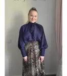 Sätt blusens fåll innanför midjan på en kjol eller byxor med hög midja om du vill framhäva midjan bättre och framhäva dina feminina former. Du kan också låta fållen fladdra fritt. Blusen har en lös design, men blusens material sträcker sig inte mycket.
