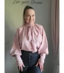 Rosa långärmad blus med baggy ärmar och knuten fluga. En fluga knuten till kragen på en blus är en fantastisk detalj som får beröm. Blusen har även härliga väskärmar och manschetterna är dekorerade med snygga knappar.