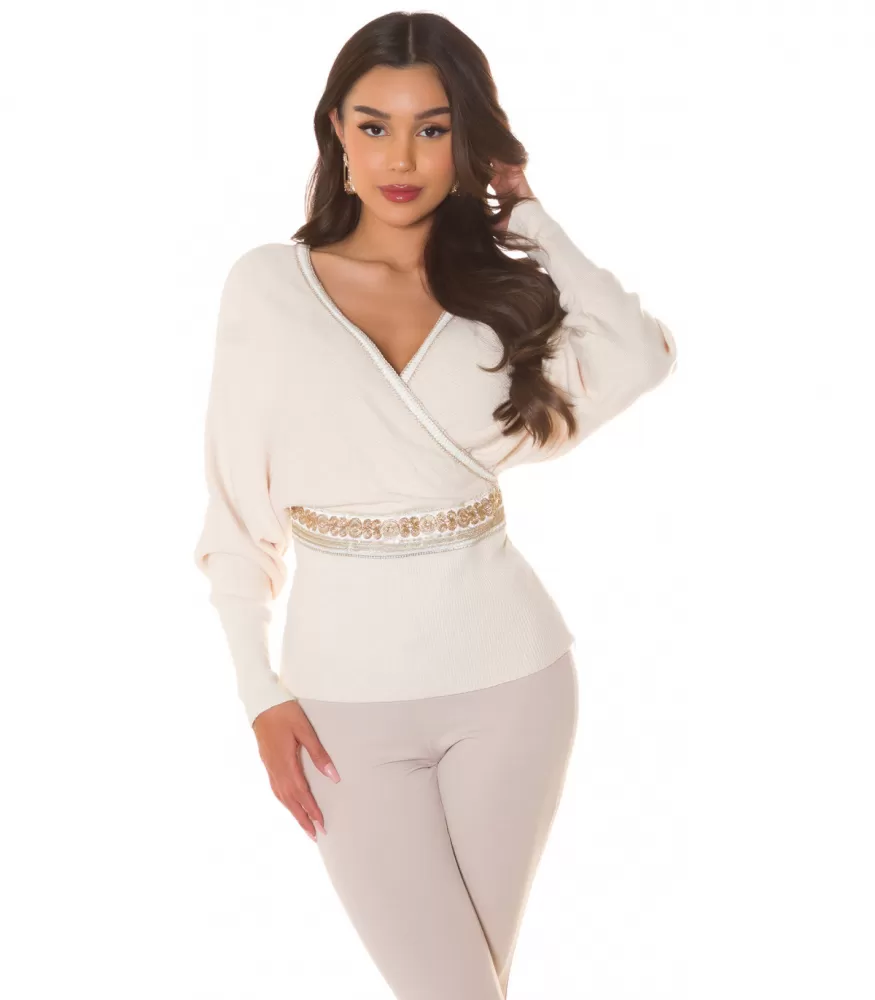 Beige långärmad dekorativ fladdermusärm omlott-look v-stickad. En vacker broderad beige tröja med fladdermusärmar och andra flashiga detaljer är det perfekta valet för kallare väder. En imponerande, festlig tröja med v-ringning passar till en dejt, middag eller andra tillfällen som kräver en nättare klänning. Med enkla accessoarer passar tröjan även till vardags. Denna feminina tröja är perfekt när du letar efter en vacker stickad skjorta där du kommer att känna dig vacker och självsäker. De imponerande detaljerna på tröjan och den feminina modellen får beröm.