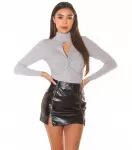 Blå långärmad tröja med hög krage med iögonfallande knutdetalj och titthål. En spektakulär pikétröja med härliga detaljer är perfekt för en dejt. En vacker stickad skjorta med knutar som formar sig efter kroppen framhäver feminina former. En monokrom tröja med feminint snitt är också perfekt för vardagsbruk. Den multifunktionella stickade skjortan passar till många olika outfits och olika situationer. Till vardags kan du välja enkla accessoarer och till exempel svarta jeans. För en festligare look, välj mer spektakulära accessoarer, raka byxor eller en feminin kjol. Den blå pikétröjan är utsökt, och i den blå färgen sticker de spektakulära detaljerna på tröjan ut magnifikt.